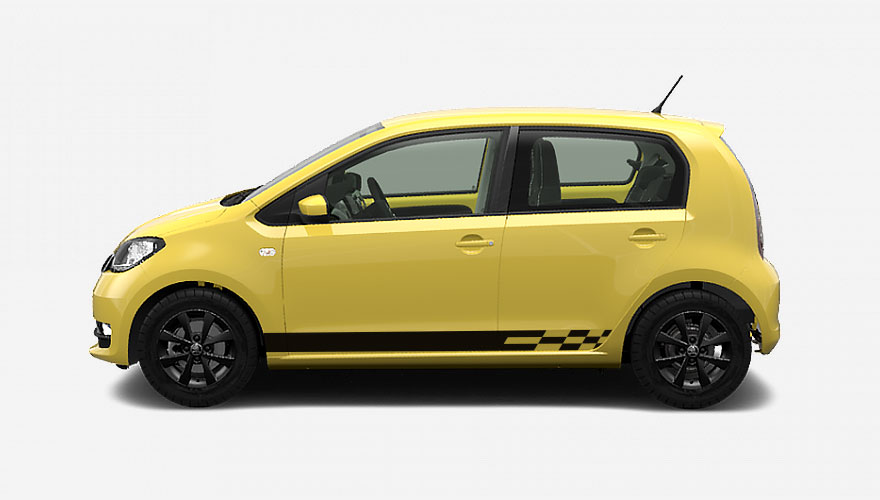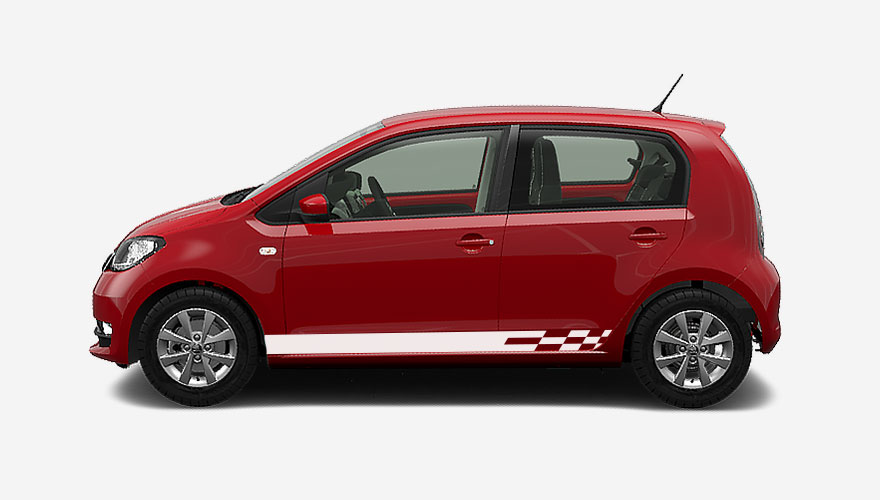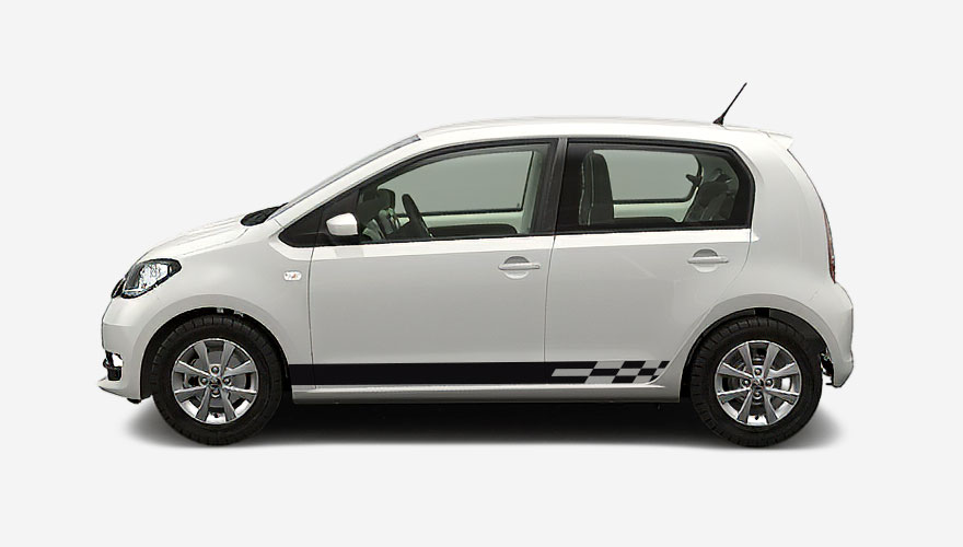 Polepy na bok auta - sportovní pruhy zakončené šachovnicí na Škodu Citigo. Polep může být umístěn na bocích auta, ale také vzadu na dveřích kufru. Jedná se o originální design Škody Citigo Sport.
