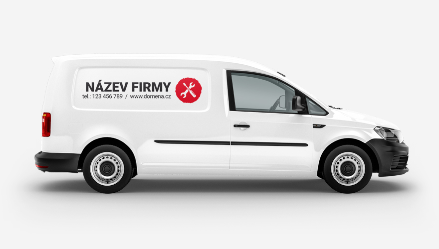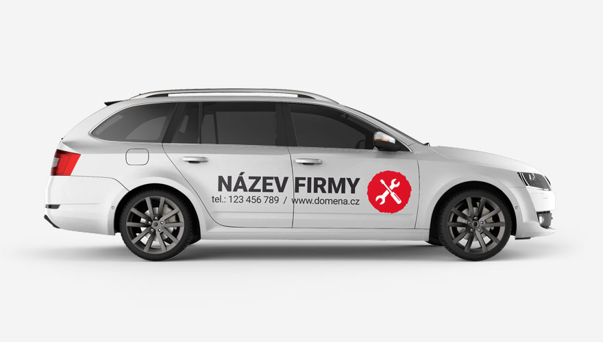 Nápis (název firmy, činnost, jméno, kontakty) na boku auta + zubatý kruh s ikonkou činnosti. Barvy textu, kruhu i ikony je možné libovolně změnit. V nabídce máme několik ikonek pro různé činnosti a povolání. Cena obsahuje 2 kusy polepů (na obě strany auta).