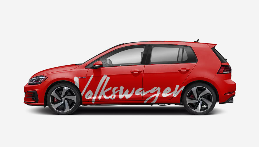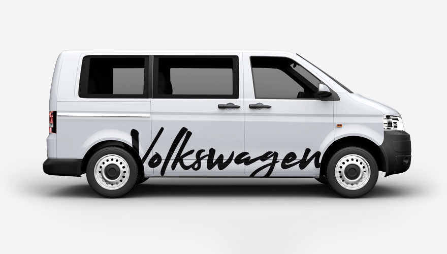 Ručně psaný název Volkswagen na bok auta. Velikost i barvu polepů je možné libovolně upravit. Cena obsahuje 2 kusy polepů (na obě strany auta).