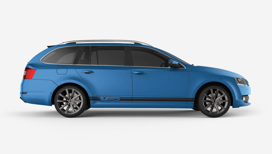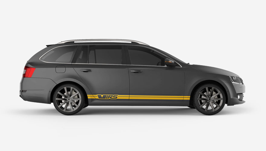 Polepy na bok auta - jednoduchý pruh na spodní hranu dveří s logem VRS. Logo je možné změnit za nápis Škoda nebo libovolný jiný text či logo. Výška pruhu je 8-10 cm.