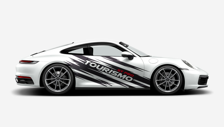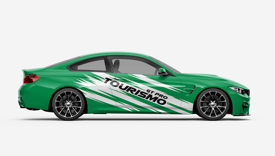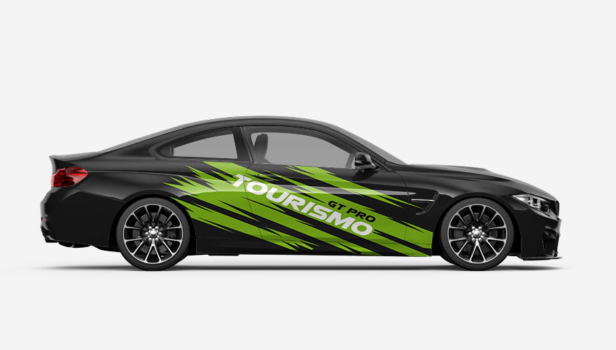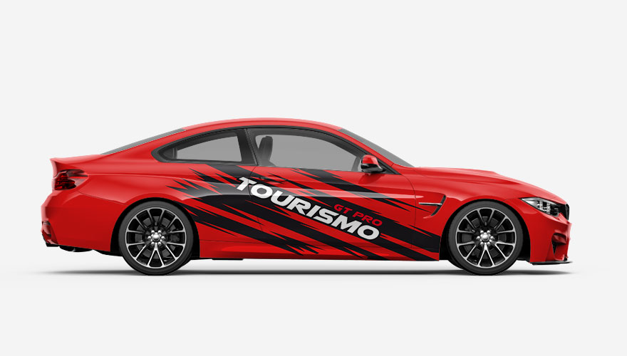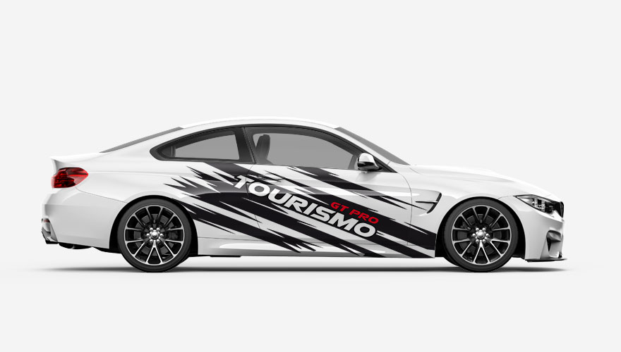 Polepy na boky auta - klikaté pruhy s nápisem GT Pro Tourismo. Text na polepu i jeho barvy je možné jakkoliv změnit.
