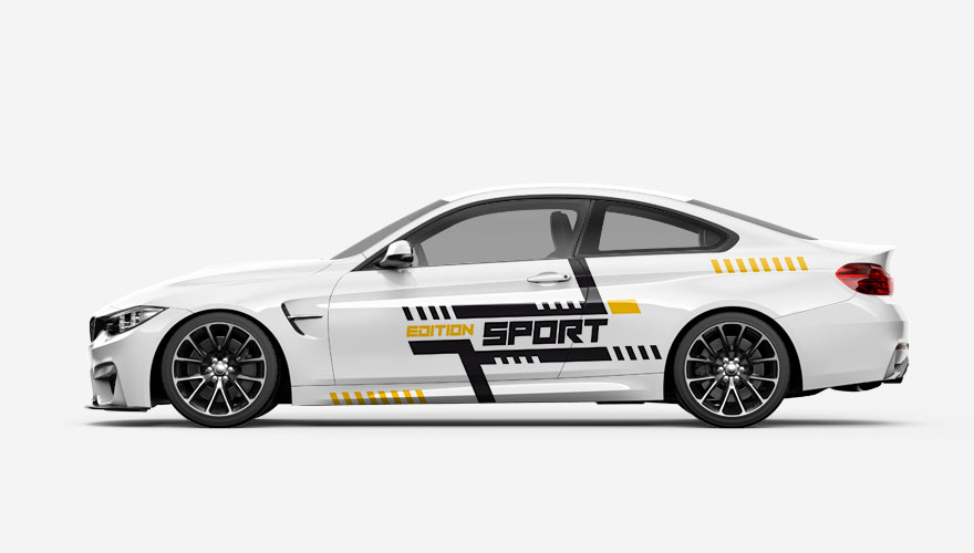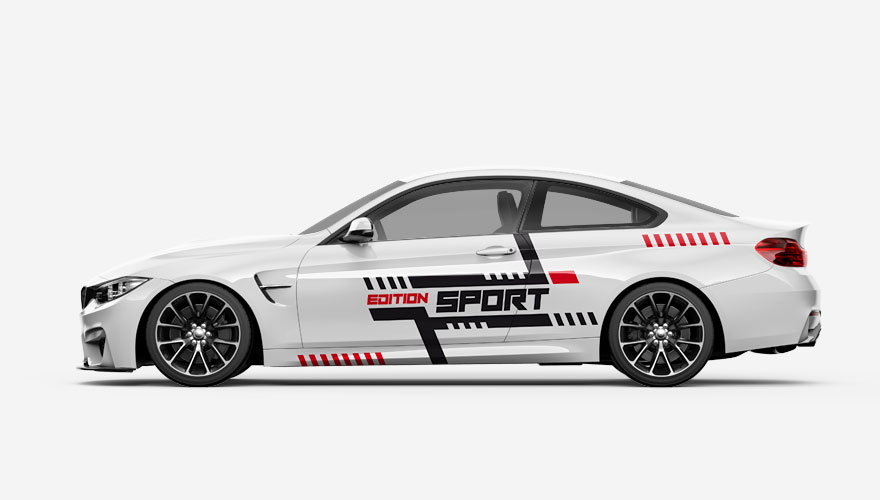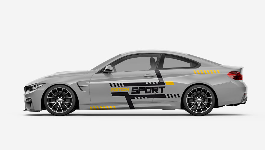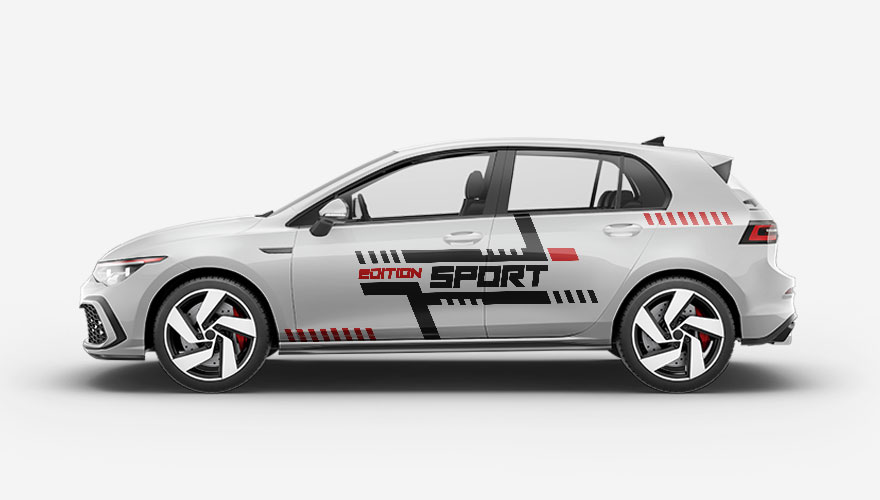 Polepy na boky auta - barevné pruhy a šrafy s nápisem Edition Sport (nápis je možné jakkoliv změnit). Barvy i velikost pruhů můžeme také upravit.