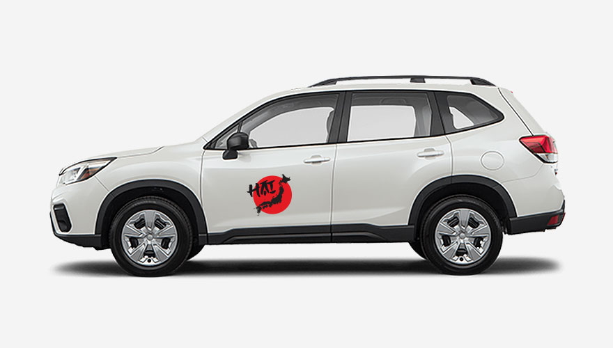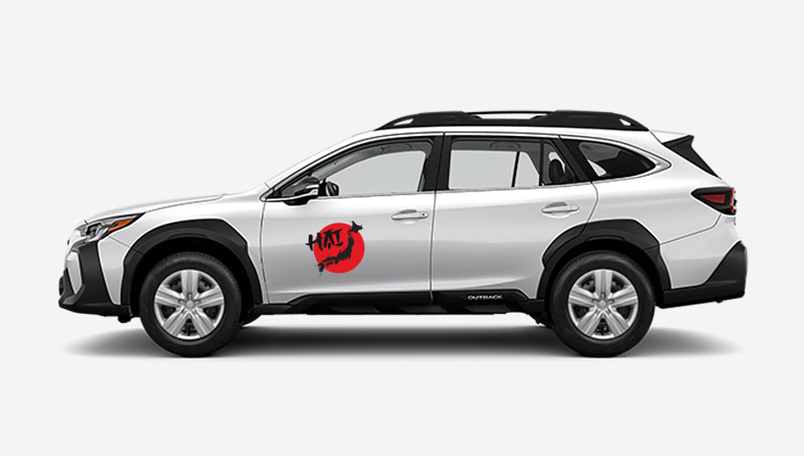 Polepy na boky auta s červeným kruhem ve stylu Japonské vlajky se siluetou Japonská a nápisem HAI, který v japonštině znamená Ahoj.