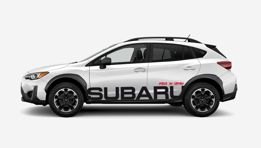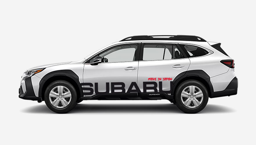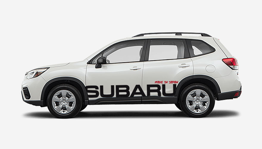 Velký nápis SUBARU přes celý bok auta s menším nápisem Made in Japan. Velikost i barvy textů je možné přizpůsobit na konkrétní model Subaru.