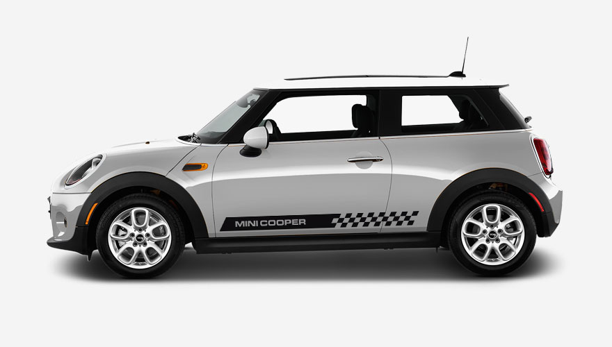 Polepy na bok auta - pruh s nápisem nebo logem Mini zakončený závodní šachovnicí. Polep je určen na vozy Mini.