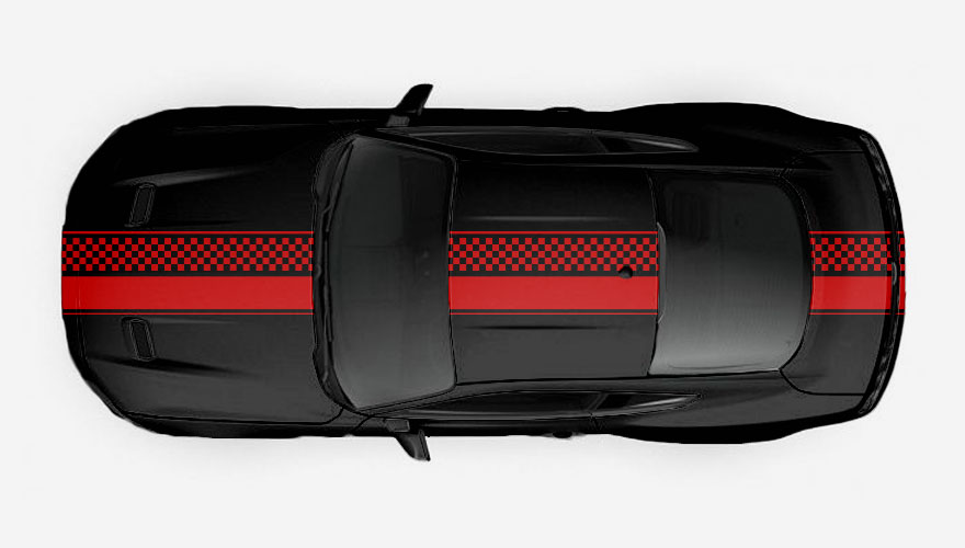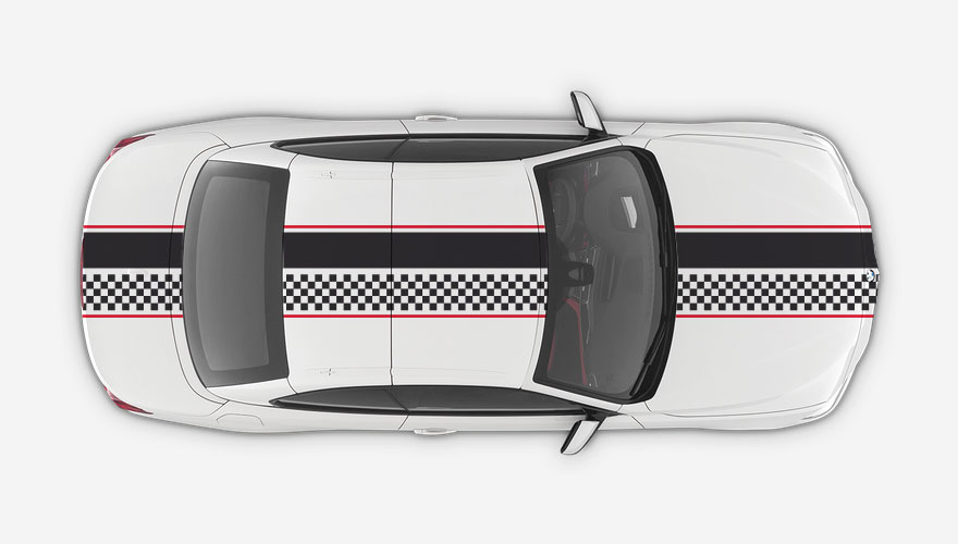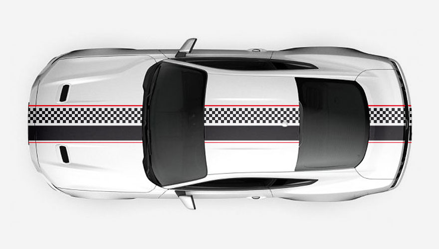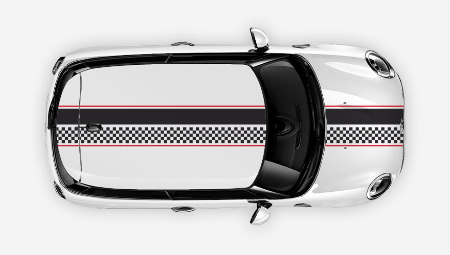 Polep přes celé auto - rychlé pruhy se šachovnicí s lemováním. Polep přes kapotu, střechu a zadní část vozu. Polep je možné udělat i jen přes kapotu, tak jak to mají vozidla Mini ... celý popis