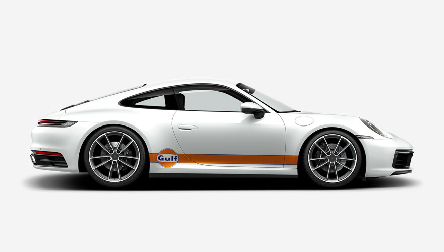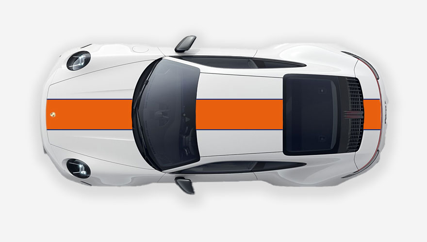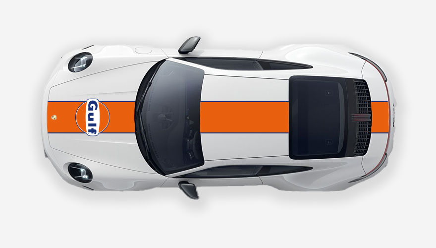 Polepy přes celé auto ve stylu Gulf Racing. Polep je možné udělat s logem Gulf nebo místo něj dát libovolný nápis nebo závodní číslo, případně ho můžeme udělat jen jako barevný pruh.