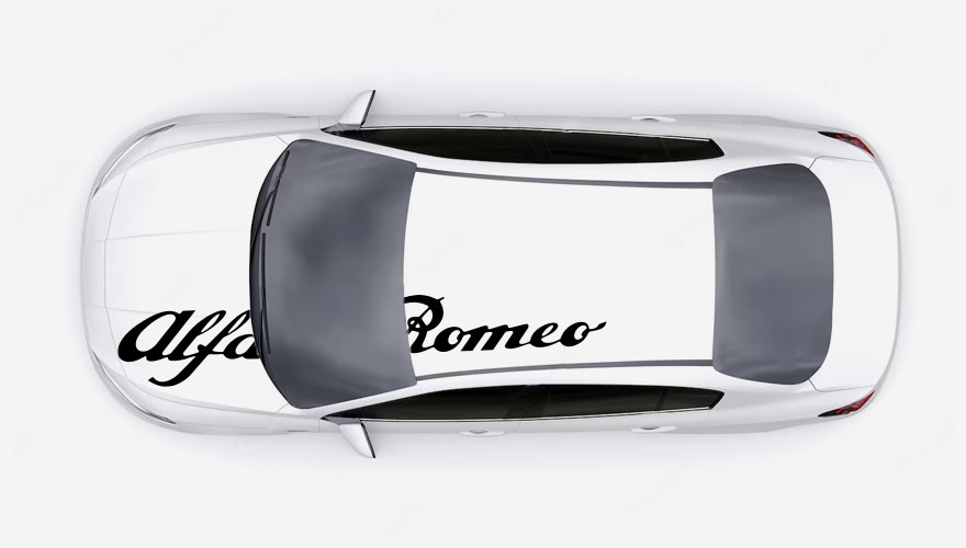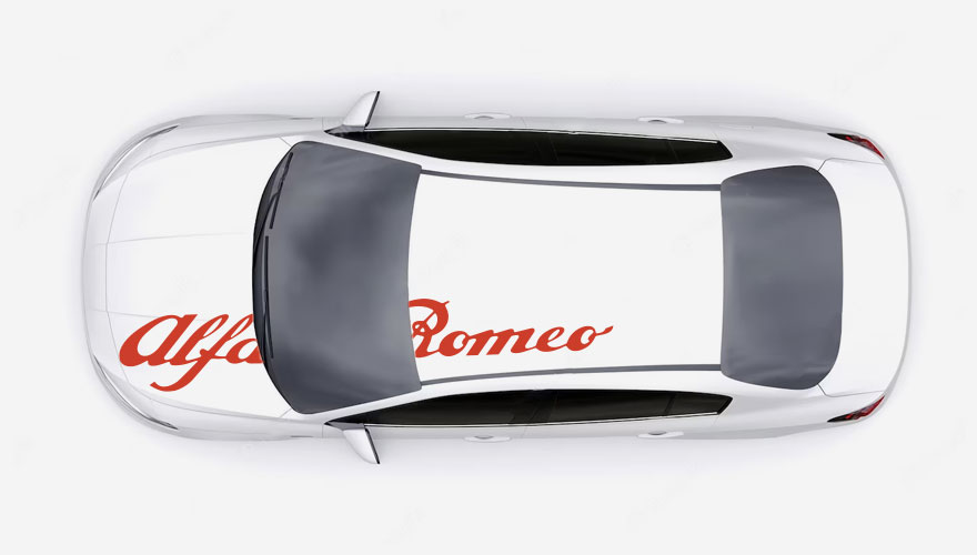 Polep na kapotu a střechu s nápisem Alfa Romeo. Velikost, umístění i barvu je možné před výrobou jakkoliv změnit.