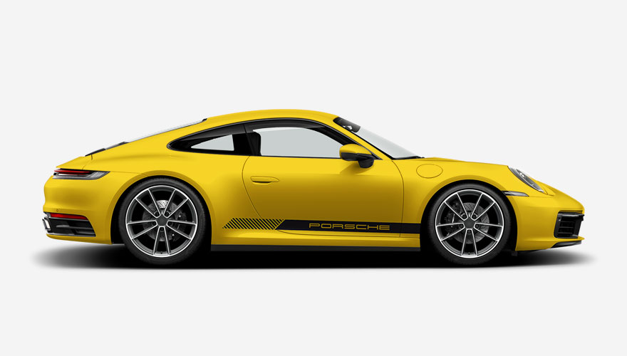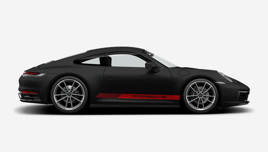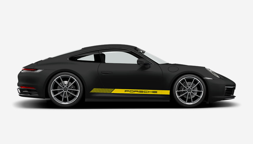 Pruh na bok auta s nápisem Porsche. Nápis je umístěn tak, aby byl vždy přes dveře a přesně seděl na obě strany. Polep je navržený na všechna dvoudveřová Porsche (např. 911, Cayman, Boxster, ...), ale dokážeme ho udělat i větší (např. na Cayenne, Panamera, Taycan, Macan, ...).