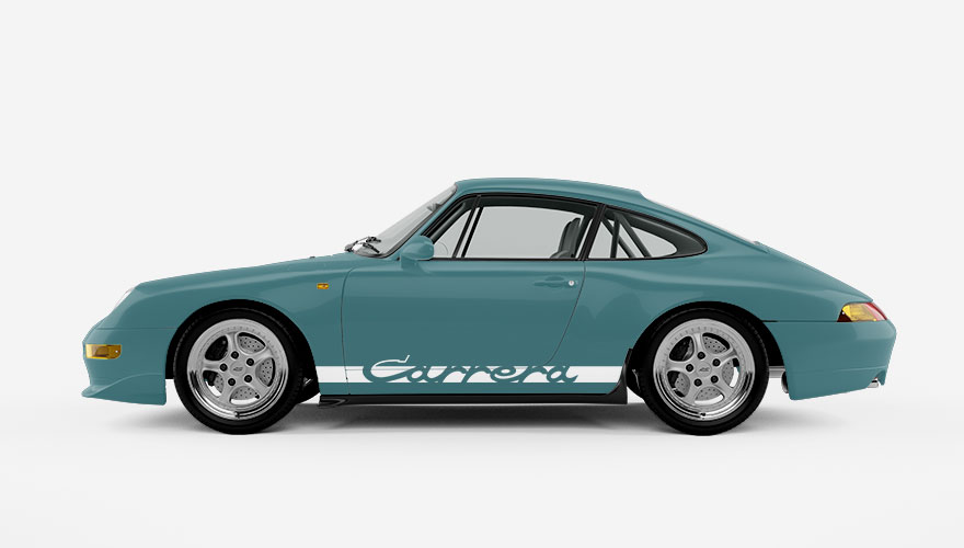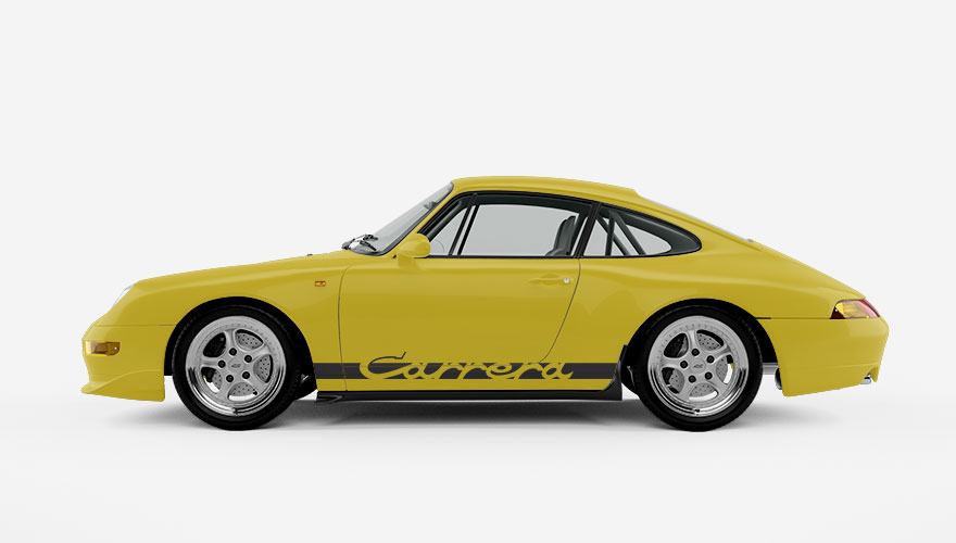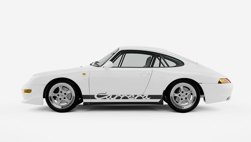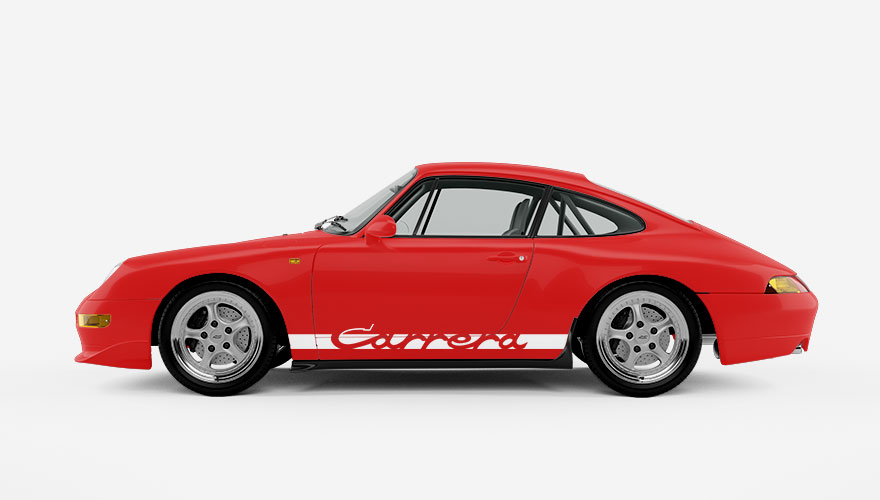 Polepy na boky - pruh na Porsche s nápisem Carrera. V pruhu je starší verze loga, které se používalo zhruba do roku 1995 např. na modelech Porsche 911 Carrera z 70. a 80. let s označením G-Body nebo novější 964.