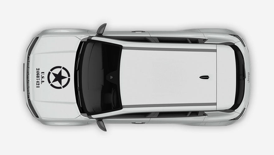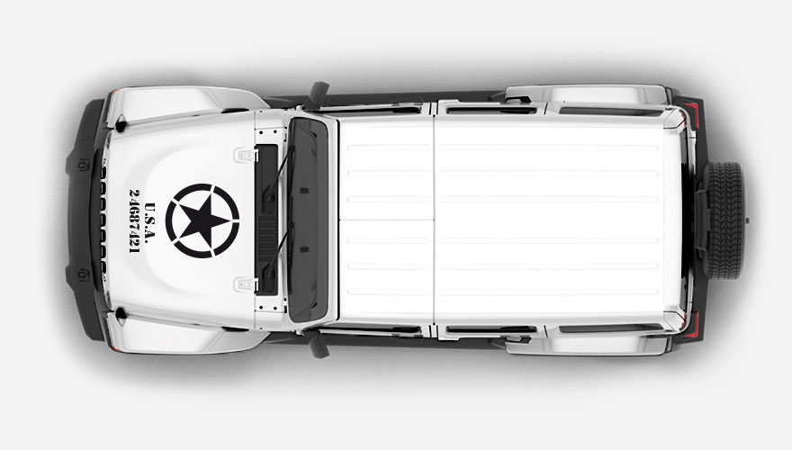 Polep na kapotu s hvězdou a nápisem USA. Nápis je možné jakkoliv změnit. Polepy jsou vhodné na americká auta např. Mustang, Dodge, Ford, Jeep, Chervrolet, RAM.