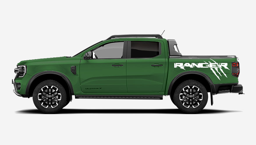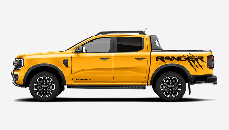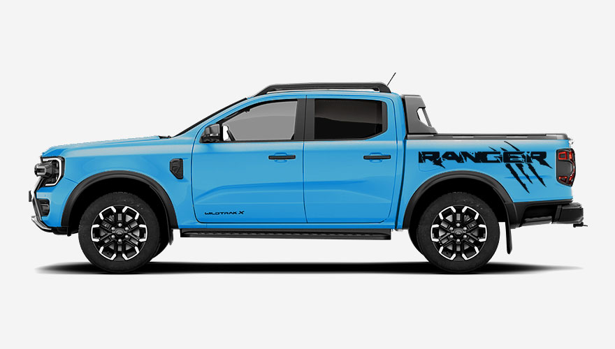 Polepy na boky Ford Ranger. Nápis RANGER a třemi pruhy v pozadí na boky korby. Cena obsahuje 2 kusy pruhů (na obě strany auta).