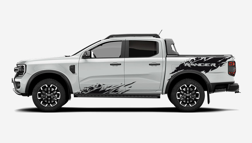 Polepy na boky Ford Ranger. Rozstříknuté pruhy (cákance) s nápisem Ranger. Cena obsahuje 2 kusy polepů (na obě strany auta).