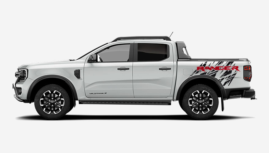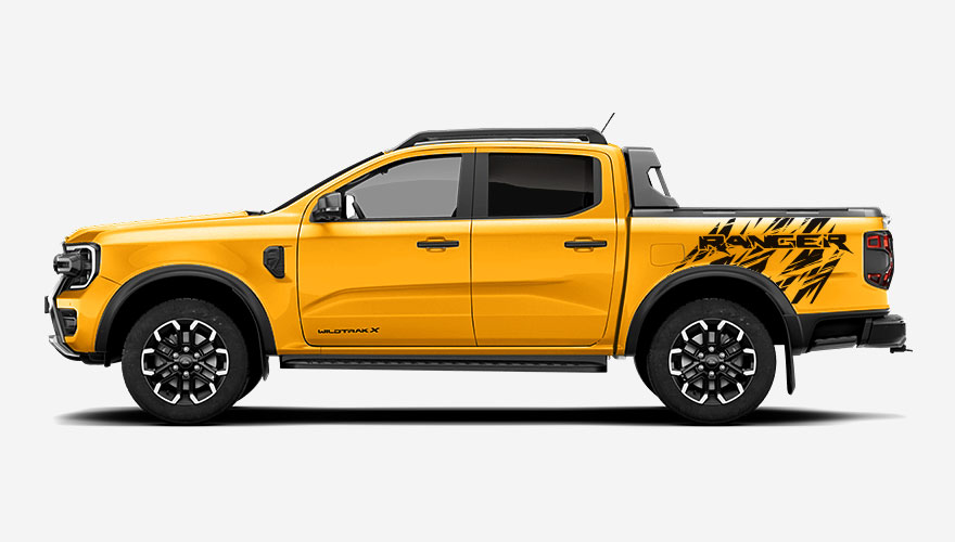Polepy na boky Ford Ranger. Nápis RANGER a třemi pruhy v pozadí na boky korby. Cena obsahuje 2 kusy polepů (na obě strany auta).