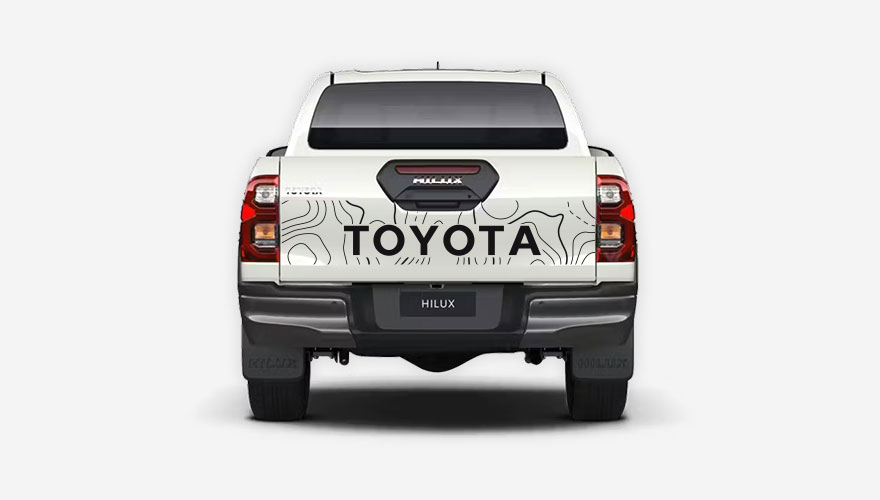 Polepy na boky Toyota Hilux - nápis TOYOTA a motiv vrstevnic z mapy na zadní dveře korby. Cena obsahuje 2 kusy pruhů (na obě strany auta).