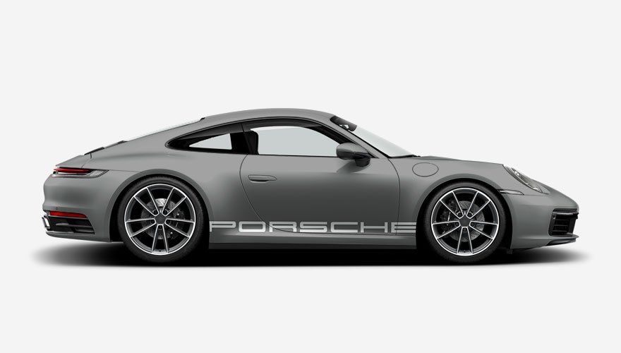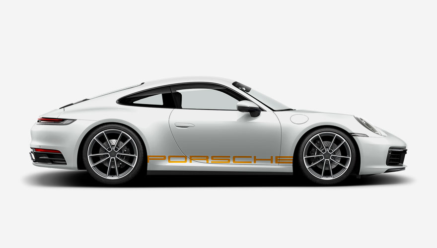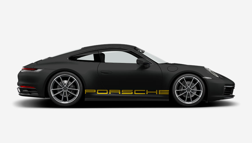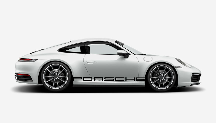Široký nápis PORSCHE na boční spodní část auta. Nápis je umístěn na celou plochu mezi předním a zadním kolem.