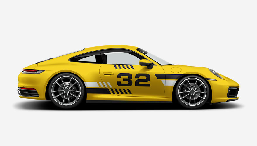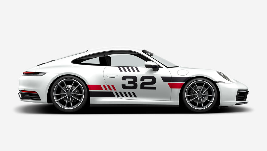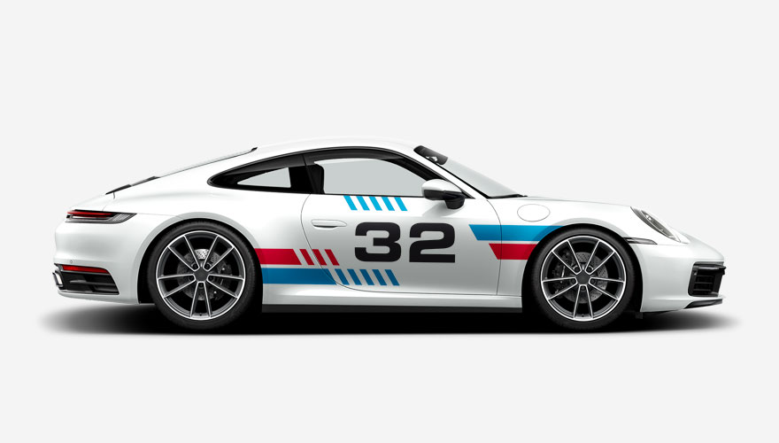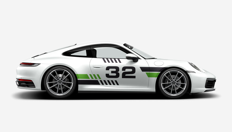 Závodní polepy na bok auta s pruhy a číslem